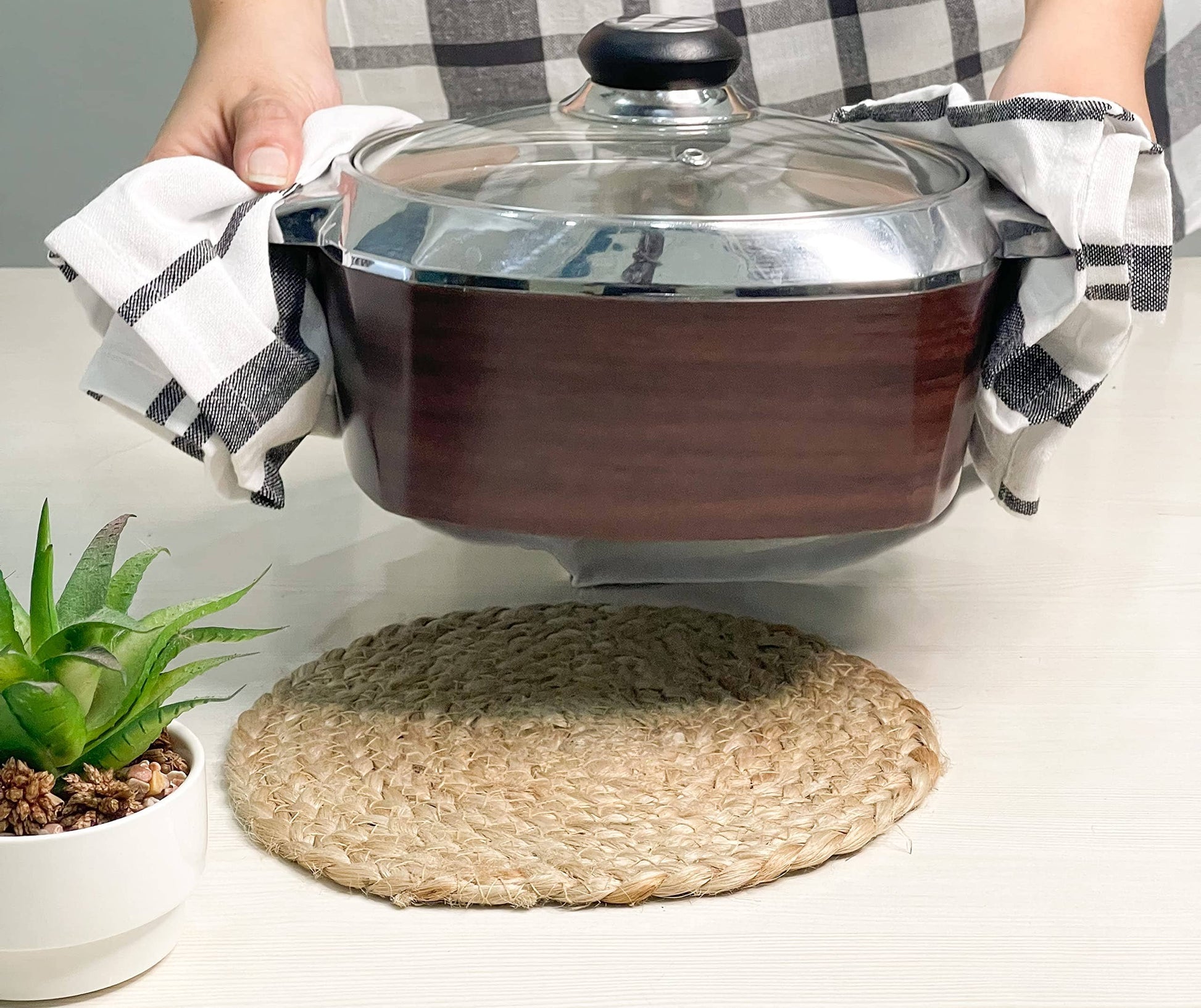 Under a hot pan, warm serving dish or for added texture on your table, the jute braided round trivets will add a rustic modern feel.