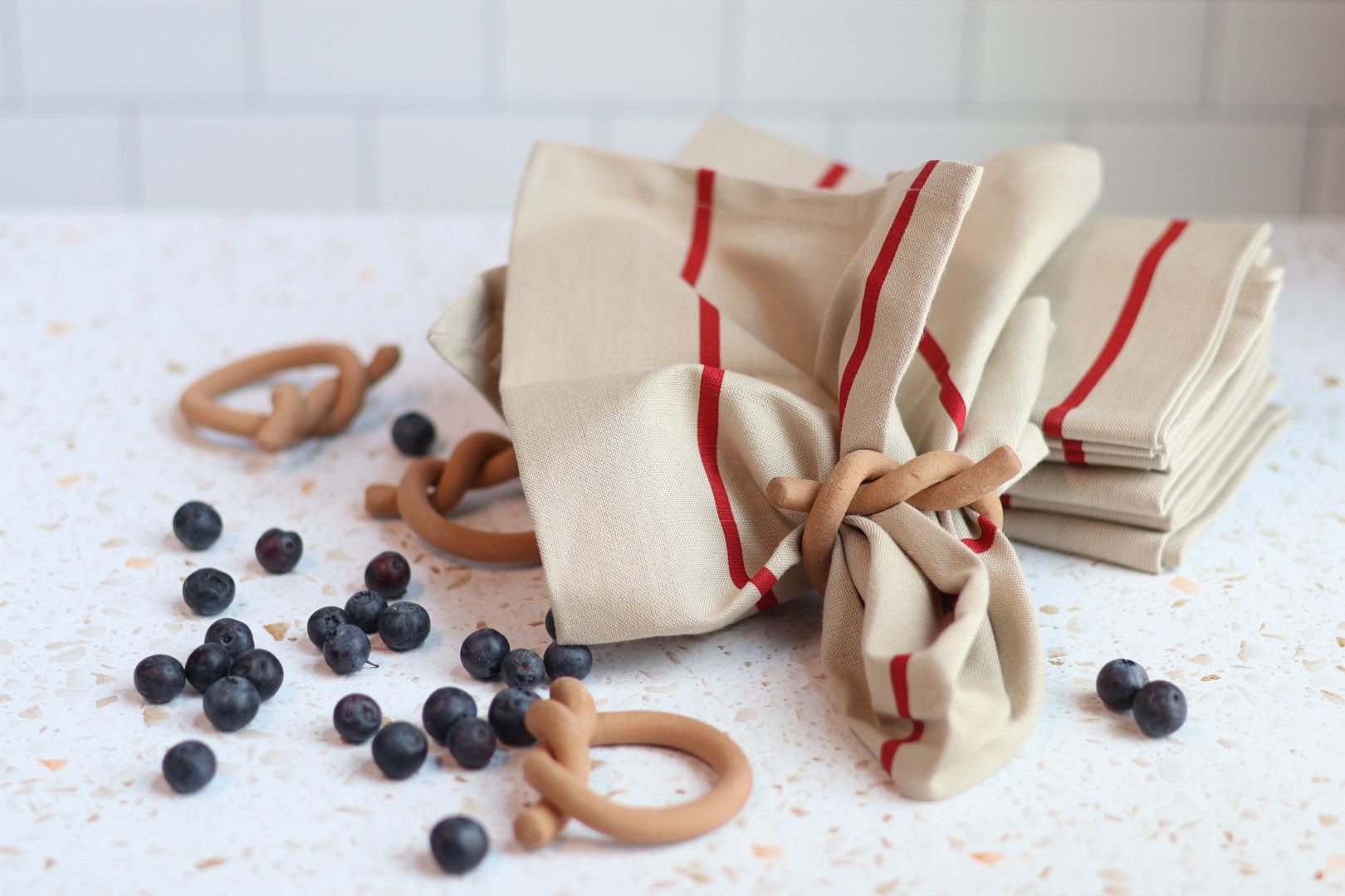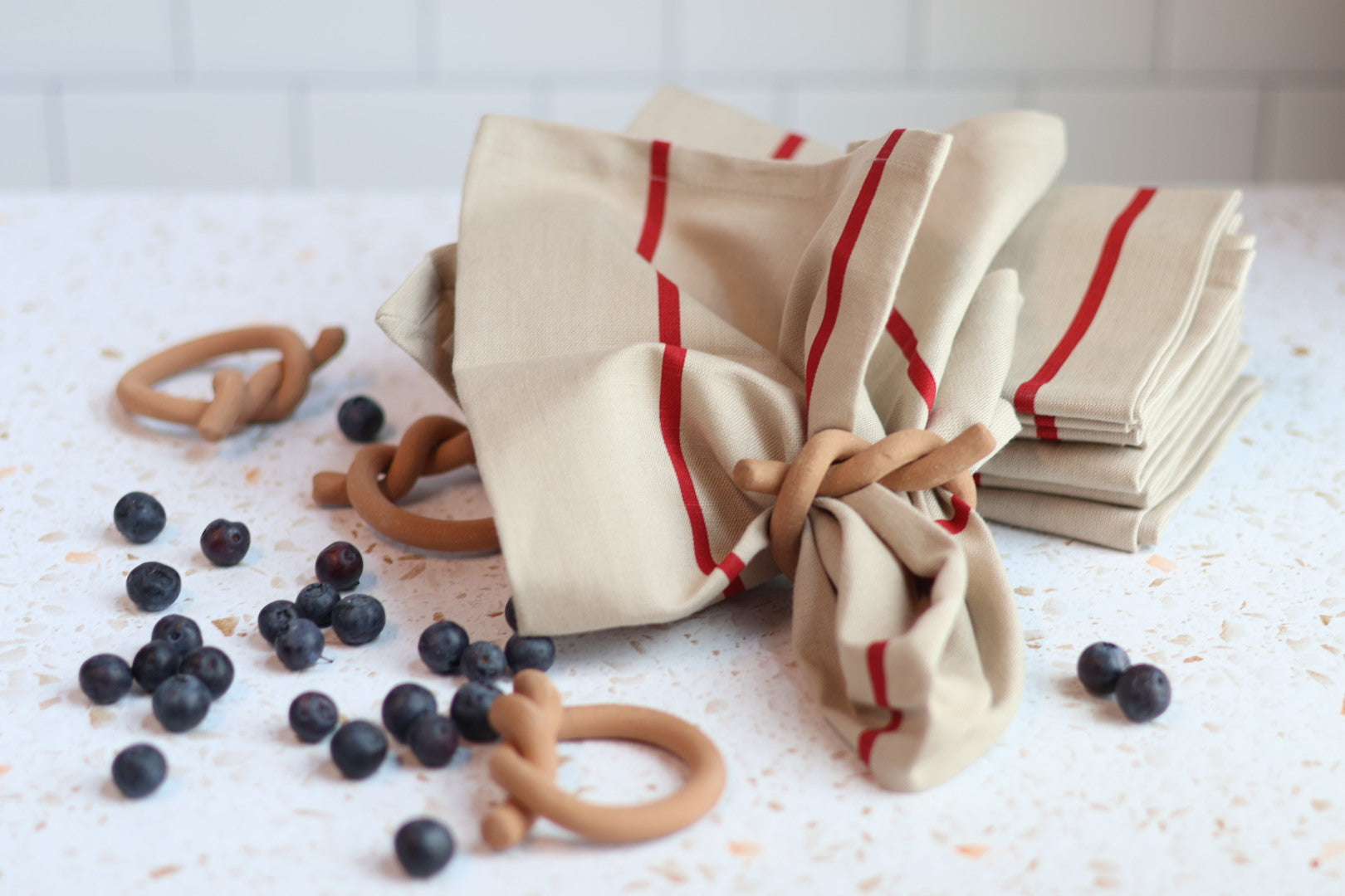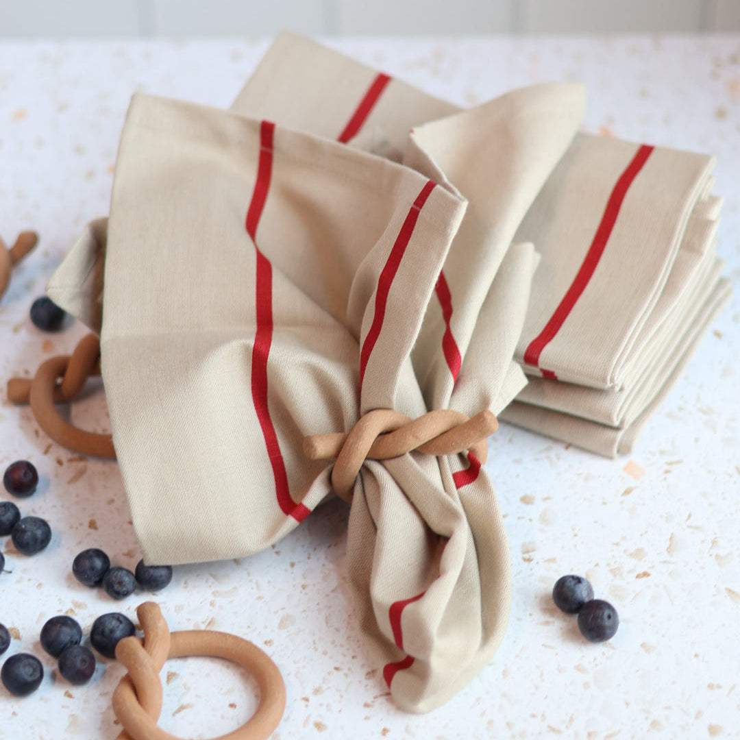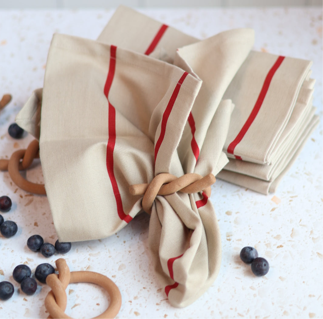 Introducing our new stylish and simple rouge napkins - perfect for adding a touch of vintage European charm to any meal. Crafted with a cotton-linen blend material, these napkins feature a neutral background with bold red stripes that evoke the spirit of classic continental style. Upgrade your table setting with these timelessly elegant napkins, designed to replace paper while providing an easy way to add a touch of sophistication to even the simplest of meals.